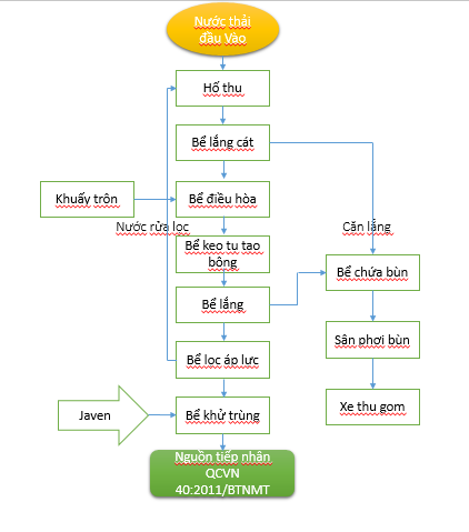 Bể khử trùng: Tại bể khử trùng ta châm chlorine theo liều lượng và nồng độ thích hợp nhằm xử lý các vi khuẩn có hại trong nước. Nước sau xử lý đạt QCVN 40:2011/BTNMT