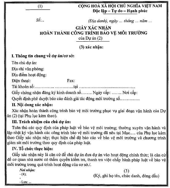 Báo cáo hoàn thành các công trình bảo vệ môi trường là hồ sơ môi trường quan trọng của các doanh nghiệp.......