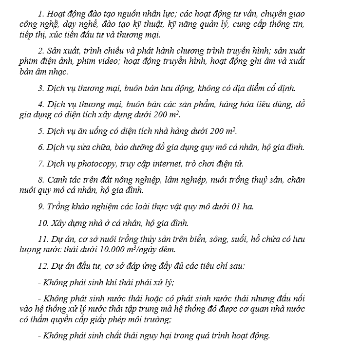 + Dự án đầu tư khi đi vào vận hành và cơ sở sản xuất, kinh doanh, dịch vụ không phát sinh chất thải hoặc chỉ phát sinh chất thải rắn sinh hoạt dưới 300 kg/ngày được quản lý theo quy định của chính quyền địa phương; hoặc phát sinh nước thải dưới 05 m3/ngày, khí thải dưới 50 m3/giờ được xử lý bằng công trình thiết bị xử lý tại chỗ hoặc được quản lý theo quy định của chính quyền địa phương.
