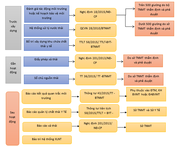 Theo hình trên. Có thể thấy 1 cơ sở Y Tế có 3 giai đoạn lập hồ sơ và thủ tục môi trường.
